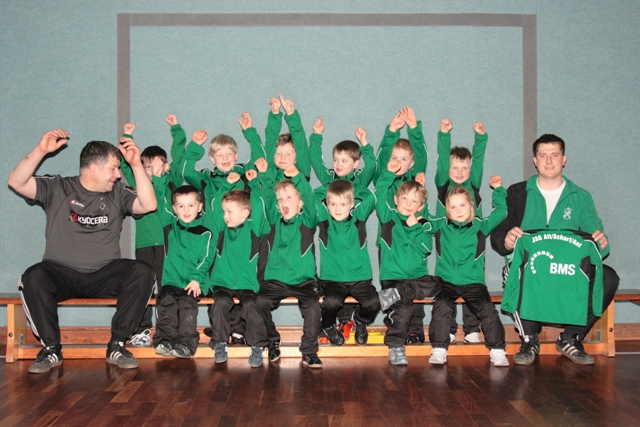 So war kurz vor den Ostertagen bei den Nachwuchskickern des Trainergespanns Schmitz / Oberdick die Freude groß, als sie von der Firma BMS einen Satz nagelneuer Trainingsanzüge überreicht bekamen. Nun ist das Outfit der Jüngsten komplett, da auch schon der Trikotsatz dankenswerterweise von der Firma BMS gesponsert wurde.