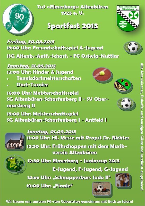 Ein Sportwochenende voller Spaß und Aktion veranstaltet der TuS »Elmerborg« Altenbüren am Samstag, 31. August, und Sonntag, 01. September, auf der heimischen Sportanlage. Der mit gut 650 Mitgliedern größte Verein des Dorfes feiert dabei das 90-jährige Vereinsjubiläum im Rahmen des Sportfestes mit zahlreichen Freunden, ehemaligen Aktiven und Gästen. Der vorgezogene Auftakt des Sportfestes ist der Fußball-A-Jugend vorbehalten. Los geht's bereits am Freitagabend um 18:00 Uhr, wenn die JSG Altenbüren / Scharfenberg / Antfeld im Rahmen eines Freundschaftsspieles gegen den FC Ostwig-Nuttlar antritt.