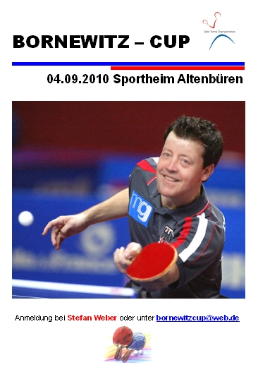 am ersten Samstag im September wird erstmals in Altenbüren der Bornewitz–Cup ausgerichtet. Dieses Turnier verspricht ganz großes Tischtennis, gespielt wird ab 16:00 Uhr auf mehreren Platten nach den internationalen Regeln des ITTF. Geplant ist ein Open-Air-Event unter der Tribüne vom Wiesengrundstadion. Die Turnhalle ist bei widrigen Witterungsverhältnissen die alternative Location. Der TuS »Elmerborg« Altenbüren stellt auch das Sportheim zur Verfügung, so können während und nach dem Sportereignis kühle Erfrischungsgetränke erworben werden.