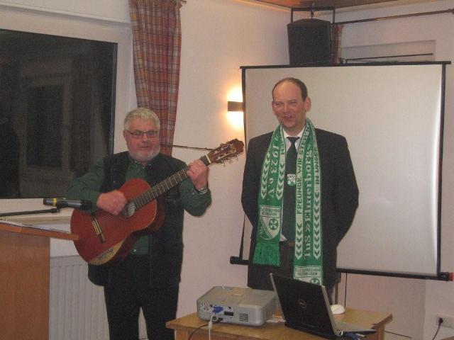 Volker Dietrich und Wolfgang Andreas singen die Sportvereinshymne. Volker wurde von der Versammlung einstimmig als TuS-Vorsitzender bestätigt und geht somit beriets in die siebte Amtszeit.