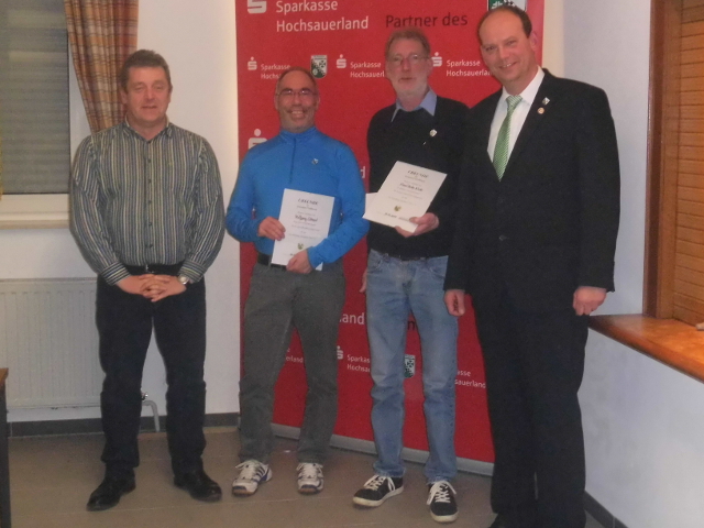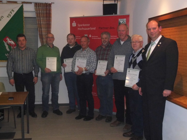 Mit Franz-Josef Göddecke, Robert Müller und Josef Stappert erhielten die anwesenden Jubilare eine Ehrenurkunde für eine – meist aktive – 60–jährige Mitgliedschaft im Verein überreicht. Gleich neun weitere Jubilare halten dem TuS schon 40 Jahre lang die Treue. Auch sie erhielten aus den Händen der Vorstandsmitglieder Dietrich und Burkhard Schwermer–Funke eine Ehrenurkunde. An alle Geehrten richtete Dietrich besondere Worte des Dankes. Gleichzeitig gab er seiner Hoffnung Ausdruck, dass die Jubilare auch weiterhin nahezu jedes Heimspiel der Seniorenmannschaften im Wiesengrund verfolgen mögen. Den an dem Abend verhinderten Jubilaren werden die Urkunden noch nachträglich ausgehändigt. Alle anwesenden Jubilare erhielten am Abend der Versammlung eine Ehrenurkunde aus den Händen der Vorstandsmitglieder Volker Dietrich und Burkhard Schwermer-Funke.